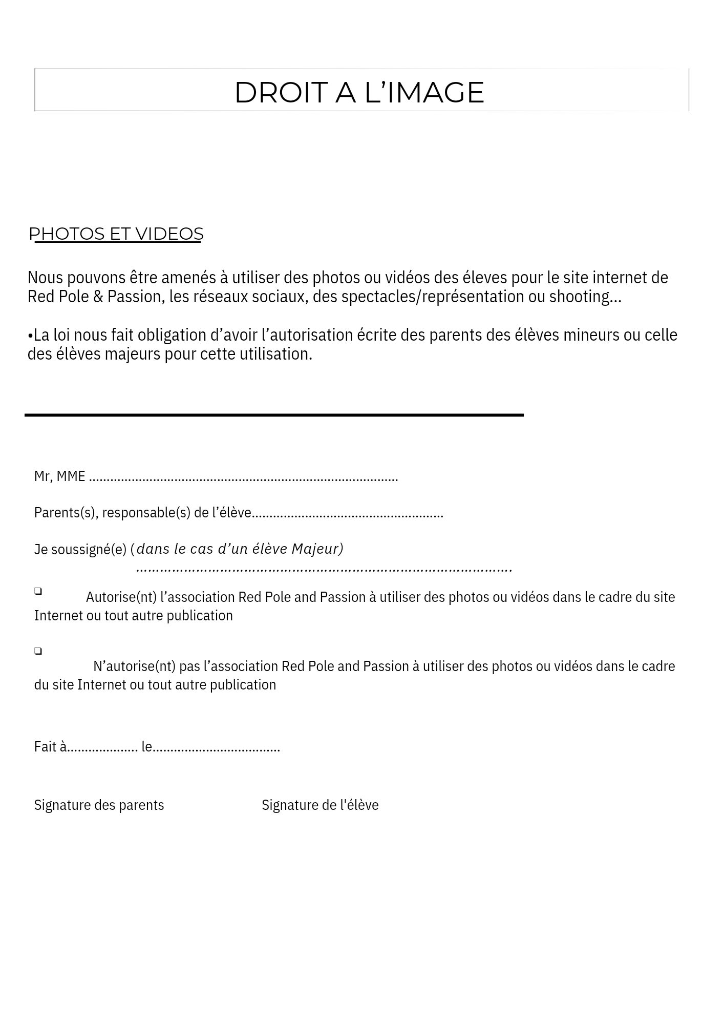 - Signer le règlement intérieur et droit à l'image